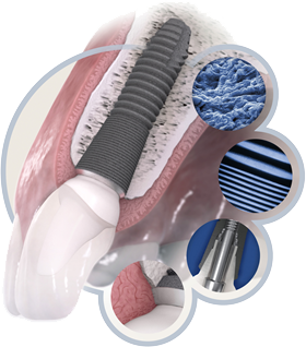 インプラント治療は歯を失った部分の骨に支柱となるインプラント(人工歯根)を埋め込み、その上に人工歯を装着する治療法です。埋め込むインプラント本体の材質はチタンのため顎骨と強固に結合する性質があります。